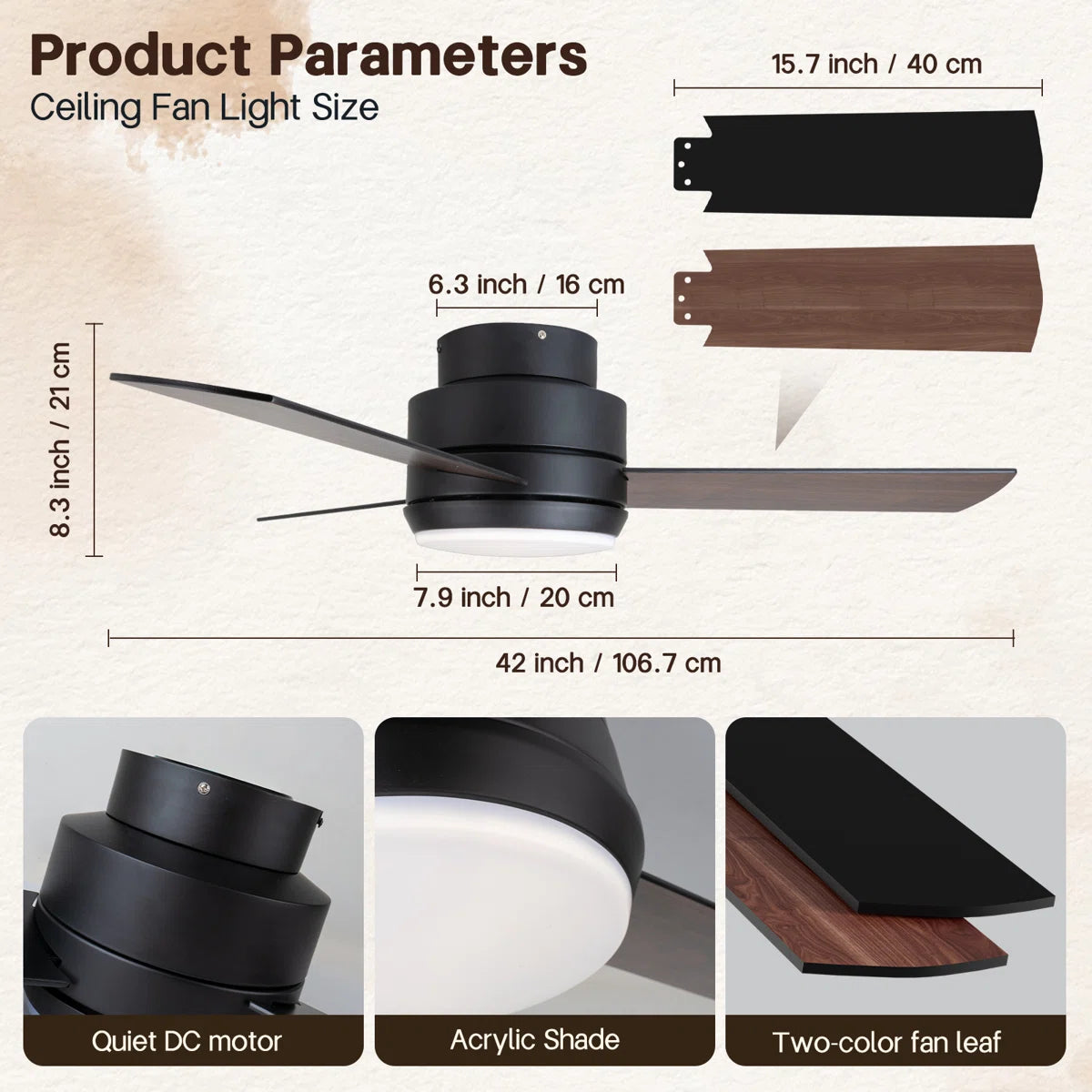 This 42-inch 3-blade ceiling fan comes with a remote control that will add a lot of character to your space. It is made of metal and has 3 solid wood blades. This fan has a 35-watt DC reversible motor that is very quiet, so you don't have to endure noise in summer or winter while also saving energy. The lights and fans can be controlled independently via remote control. The light color temperature and wind speed are also easy to adjust. Integrated 18W LED It integrates dimmable LED lights that provide an efficient and soft visual aesthetic that eliminates the hassle of changing bulbs. If you're looking for a fan that's quiet and easy to install, this ceiling fan can also add a unique touch to your home. No matter what season of the year, you'll find that the comfort offered by this ceiling fan is unmatched!